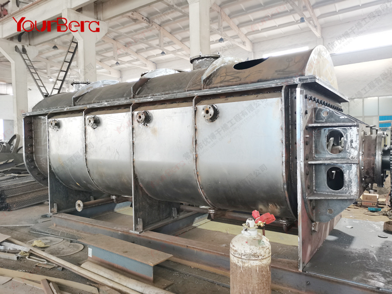 空心軸上密集排列著楔型中空漿葉,熱介質(zhì)經(jīng)空心軸流經(jīng)漿葉。單位有效容積內(nèi)傳熱面積很大,熱介質(zhì)溫度從-40℃到320℃,可以是水蒸汽,也可以是液體型:如熱水、導(dǎo)熱油等。間接傳導(dǎo)加熱,沒(méi)有攜帶空氣帶走熱量,熱量均用來(lái)加熱物料。熱量損失僅為通過(guò)器體保溫層向環(huán)境的散熱。楔型漿葉傳熱面具有自清潔功能。物料顆粒與楔型面的相對(duì)運(yùn)動(dòng)產(chǎn)生洗刷作用,能夠洗刷掉楔型面上附著物料,使運(yùn)轉(zhuǎn)中一直保持著清潔的傳熱面。漿葉干燥機(jī)的殼體為Ω型,殼體內(nèi)一般安排二到四根空心攪拌軸。殼體有密封端蓋與上蓋,防止物料粉塵外泄而充分發(fā)揮作用。