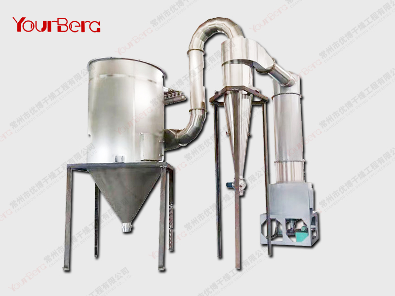 粒度分級(jí):在干燥主機(jī)的上部設(shè)置環(huán)形擋板,此被稱為閃蒸干燥機(jī)分級(jí)器。當(dāng)物料運(yùn)動(dòng)經(jīng)過(guò)該分級(jí)器時(shí)變會(huì)受到離心力的作用,呈現(xiàn)不同旋轉(zhuǎn)半徑螺旋上升的趨勢(shì)。粒徑較小的物料從分級(jí)器的內(nèi)孔排出;顆粒較大的物料被留在干燥室內(nèi)繼續(xù)粉碎,待達(dá)到標(biāo)準(zhǔn)粒度從內(nèi)孔排出。