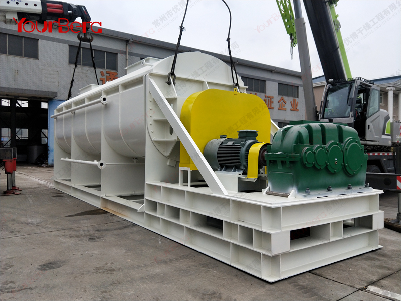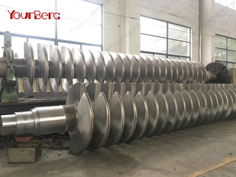 空心軸上密集排列著楔型中空漿葉,熱介質(zhì)經(jīng)空心軸流經(jīng)漿葉。單位有效容積內(nèi)傳熱面積很大,熱介質(zhì)溫度從-40℃到320℃,可以是水蒸汽,也可以是液體型:如熱水、導(dǎo)熱油等。間接傳導(dǎo)加熱,沒有攜帶空氣帶走熱量,熱量均用來加熱物料。熱量損失僅為通過器體保溫層向環(huán)境的散熱。楔型漿葉傳熱面具有自清潔功能。物料顆粒與楔型面的相對運動產(chǎn)生洗刷作用,能夠洗刷掉楔型面上附著物料,使運轉(zhuǎn)中一直保持著清潔的傳熱面。漿葉干燥機的殼體為Ω型,殼體內(nèi)一般安排二到四根空心攪拌軸。殼體有密封端蓋與上蓋,防止物料粉塵外泄而充分發(fā)揮作用。
