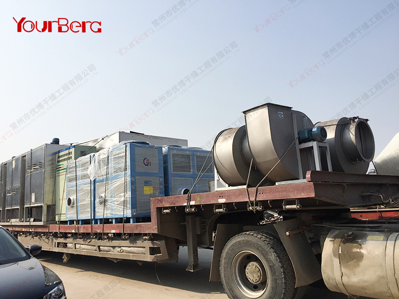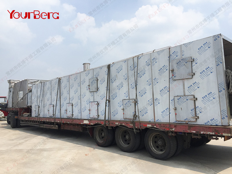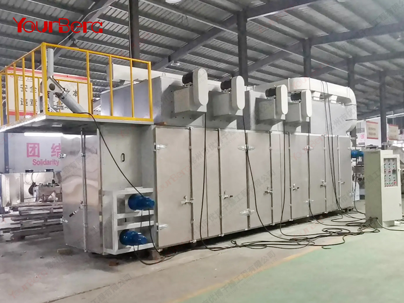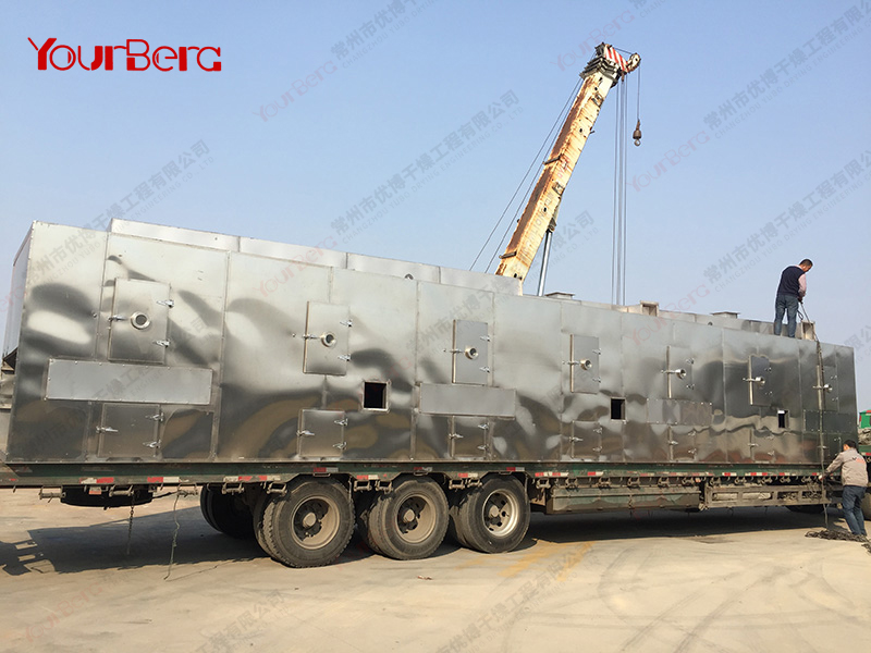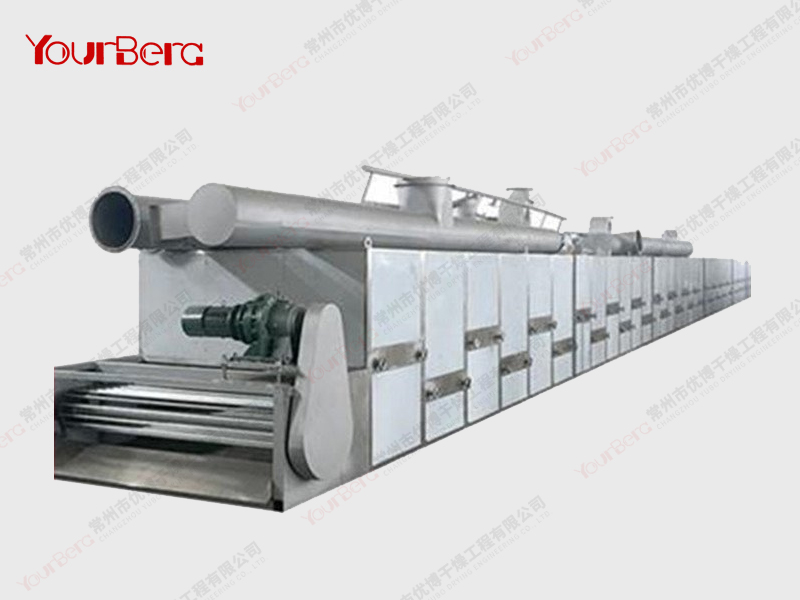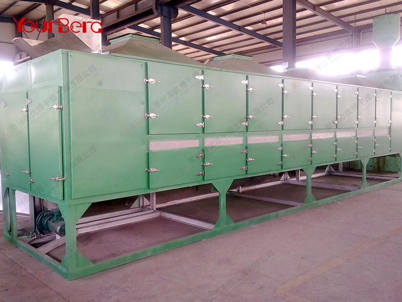 物料由加料器均勻地鋪在網(wǎng)帶上,網(wǎng)帶采用12-60目不銹鋼絲網(wǎng)。由傳動(dòng)裝置拖動(dòng)在干燥機(jī)內(nèi)移動(dòng)。干燥機(jī)由若干單元組成,每一單元熱風(fēng)獨(dú)立循環(huán),部分尾氣由專門排濕風(fēng)機(jī)排出,廢氣由調(diào)節(jié)閥控制,熱氣由下往上或由上往下穿過鋪在網(wǎng)帶上的物料,加熱干燥并帶走水分。網(wǎng)帶緩慢移動(dòng),運(yùn)行速度可根據(jù)物料溫度自由調(diào)節(jié),干燥后的成品連續(xù)落入收料器中。上下循環(huán)單元根據(jù)用戶需要可靈活配備,單元數(shù)量可根據(jù)需要選取。