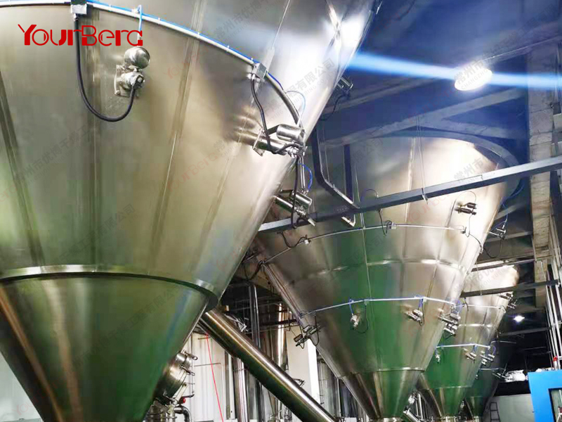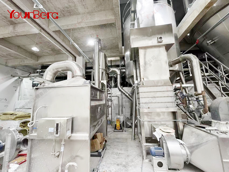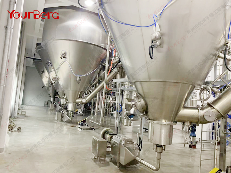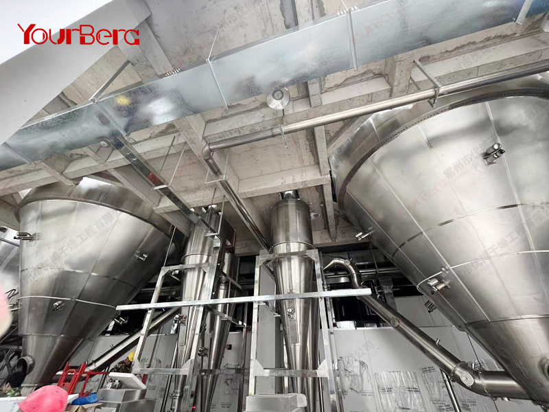 空氣經(jīng)空氣過濾器后進(jìn)入空氣加熱器,當(dāng)空氣加熱器到給定的溫度后以切線方向進(jìn)入熱風(fēng)分配器,經(jīng)熱風(fēng)分配器作用后的空氣,均勻地、螺旋式地進(jìn)入干燥室,同時料液由霧化器霧化為20~60um的霧滴,當(dāng)霧滴與熱空氣接觸后就迅速汽化干燥為粉末或顆粒產(chǎn)品。采用旋風(fēng)風(fēng)離器直接收集后經(jīng)氣力輸送至效料倉,完成物料的冷卻及輸送,廢氣由風(fēng)機排出口經(jīng)水沫除塵器排出。