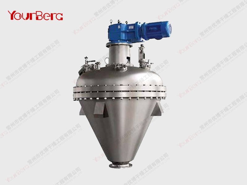 本機(jī)由加熱錐體設(shè)有加熱夾套,熱源為熱水、導(dǎo)熱油或低壓蒸汽,從而使錐體內(nèi)壁保持一定的的溫度。變頻調(diào)速電機(jī)經(jīng)平行斜齒輪減速機(jī),驅(qū)動單螺帶攪拌器旋轉(zhuǎn),帶動物料沿錐型筒旋轉(zhuǎn)并自下而上提升,物料到達(dá)最高點后由重力和慣性作用,自動流向旋渦中心回到錐型筒體底部,整個過程使物料在錐型筒體內(nèi)強制加熱,相對對流、摻混,熱量在物料中相互擴(kuò)散,使物料作全方位的不規(guī)則往復(fù)運動,完成物料同單螺帶和筒壁表面進(jìn)行高頻率傳熱交換,在短時間內(nèi)達(dá)到加熱干燥的效果。從而使物料內(nèi)部水份不斷蒸發(fā),在真空泵的作用下,水蒸汽由真空泵引出,如須回收液體可加冷凝器、回收液儲罐回收。干燥完成后,打開下部的出料閥出料。