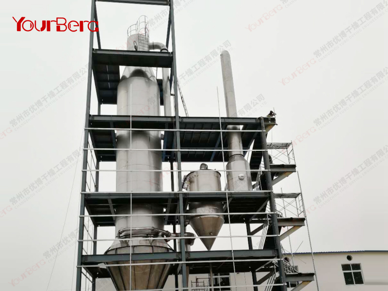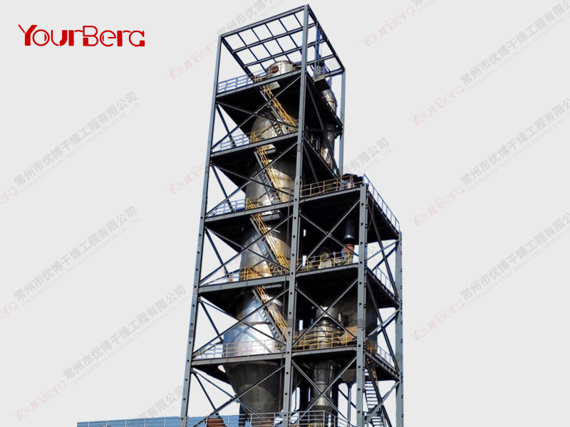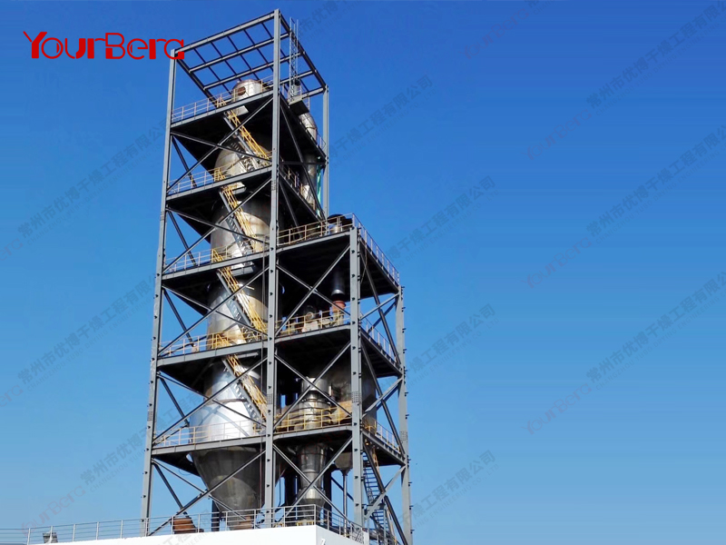 料液通過隔膜泵高壓輸入,噴出霧狀液滴,然后同熱空氣并流下降,大部分粉粒由塔底排料口收集,廢氣及其微小粉末經(jīng)旋風(fēng)分離器分離,廢氣由抽風(fēng)機排出,粉末由設(shè)在旋風(fēng)分離器下端的授粉筒收集,風(fēng)機出口還可裝備二級除塵裝置,回收率在96-98%以上。