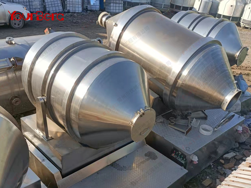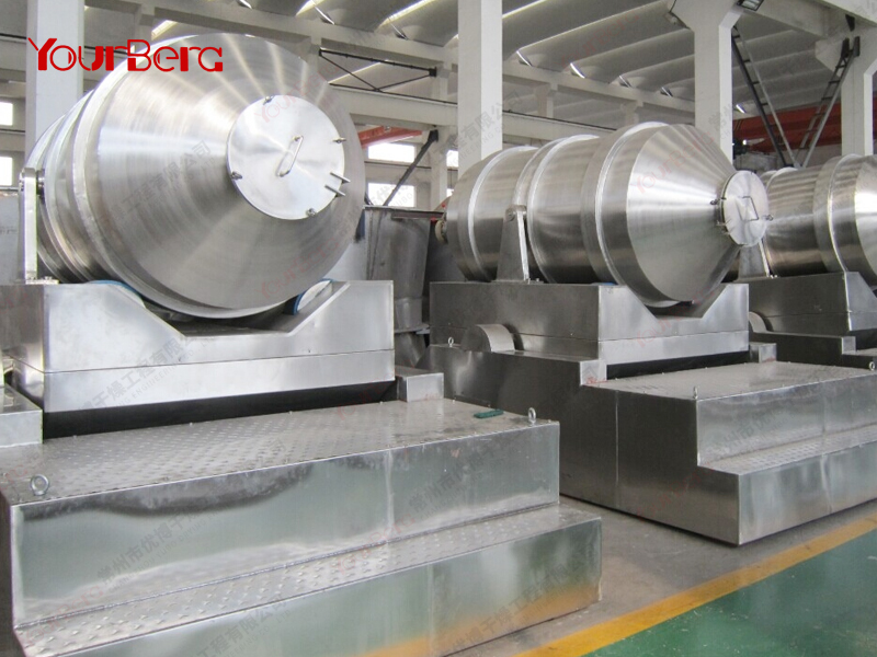EYH系列二維運動混合機主要由轉(zhuǎn)筒、擺動架、機架三大部分構(gòu)成。轉(zhuǎn)筒裝在擺動架上,由四個滾輪支撐并由兩個擋輪對其進行軸向定位。在四個支撐滾輪中,其中兩個傳動輪由轉(zhuǎn)動動力系統(tǒng)拖動使轉(zhuǎn)筒產(chǎn)生轉(zhuǎn)動;擺動架由一組曲柄擺桿機構(gòu)來驅(qū)動,曲柄擺桿機構(gòu)裝在機架上,擺動架由軸承組件支撐在機架上。