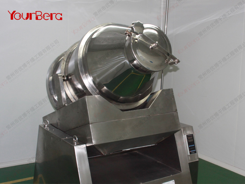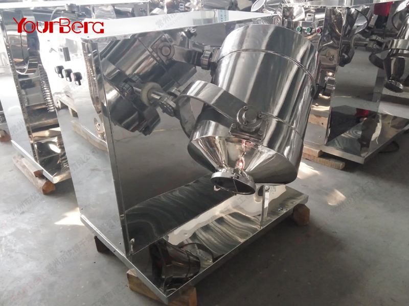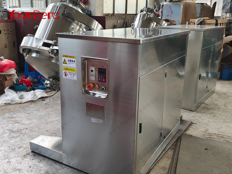 結(jié)構(gòu):該機由機座、傳動系統(tǒng)、電器控制系統(tǒng)、多向運動機構(gòu)、混合筒等部件組成。與物料直接接觸的混合筒采用不銹鋼材料制造,桶體內(nèi)外壁均經(jīng)鏡面拋光。
