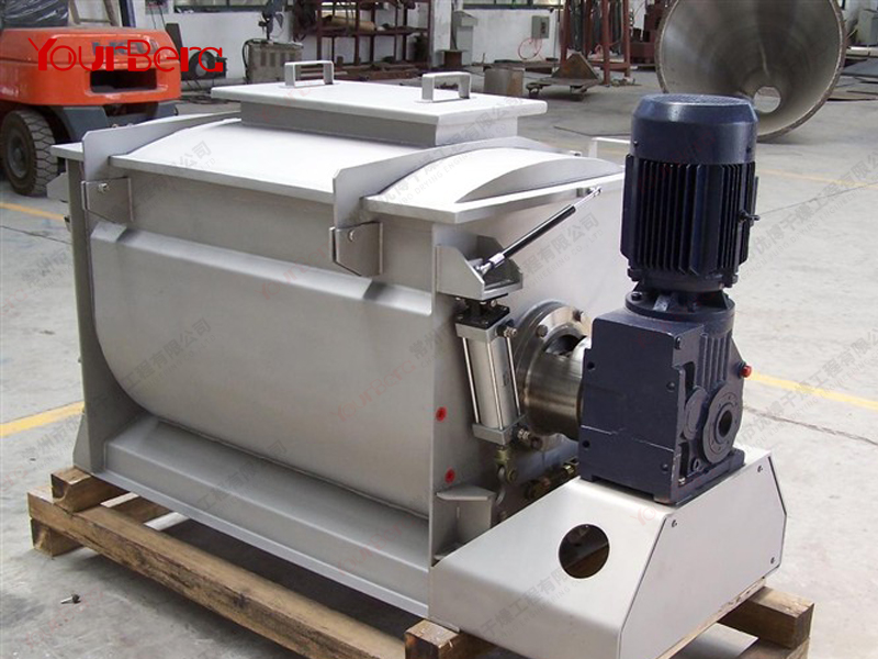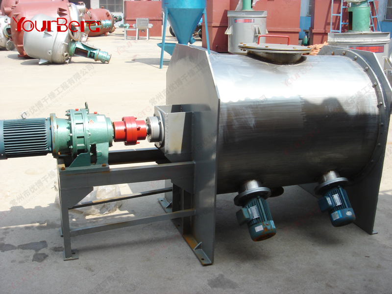 臥式螺帶混合機(jī)由安裝于攪拌軸上的內(nèi)外徑螺旋帶動桶體內(nèi)物料翻動,使攪拌器在桶體內(nèi)大范圍翻動物料。攪拌器結(jié)構(gòu)上,螺旋設(shè)計(jì)成內(nèi)外、左右互為反螺旋,攪拌器工作時(shí)內(nèi)螺旋帶動靠近軸心處物料做軸心旋轉(zhuǎn),軸向由內(nèi)至兩側(cè)推動,外螺旋帶動靠近筒壁物料做軸心旋轉(zhuǎn),軸向由兩側(cè)至內(nèi)推動,于是造成物料在筒體內(nèi)對流循環(huán)、剪切滲混,完成物料在較短時(shí)間內(nèi)快速均勻混合。